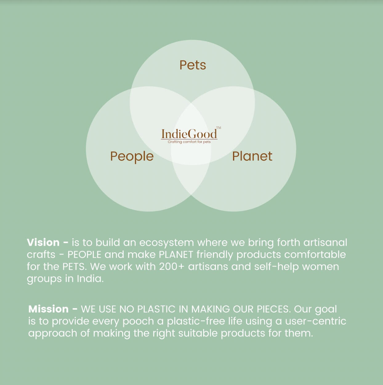IndieGood is a homegrown design brand building a range of handcrafted lifestyle products for Pets. We celebrate Indian craftsmanship and share stories through our design.Our vision is to build an ecosystem where we support artisanal crafts from Rural India (PEOPLE) and make Eco friendly (PLANET) and sustainable products for the PETS.Our journey of working with indigenous artisans is what we love to do and we aim to do more. We wish and hope to uplift, encourage and be a positive light in the industry.We began our journey to make handcrafted artisanal accessories for Pets when we realised the market is flooded with plastic and nylon-based accessories that give them rashes or choosing the wrong product and using poly-fill can also choke and bring discomfort to the pets.