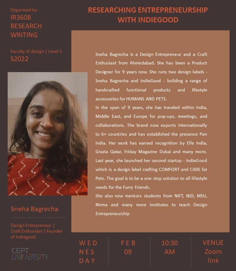 Hi I’m Sneha - a Craft Enthusiast and a Sustainable Product Designer from Ahmedabad India.I run a team of Creative Enthusiasts offering design services and manufacturing solutions for Lifestyle Collectives for 11 years now. We love exploring new materials to build innovative products for Humans and Pets.Our production is done through rural/urban artisans and 250+ women self-help groups in India.Find more about our work on - www.indiegood.comIn the span of 11 years, I have traveled within India, Middle East, UK and Europe for pop-ups, meetings, and collaborations. We export internationally to 4+ countries now and PAN India.